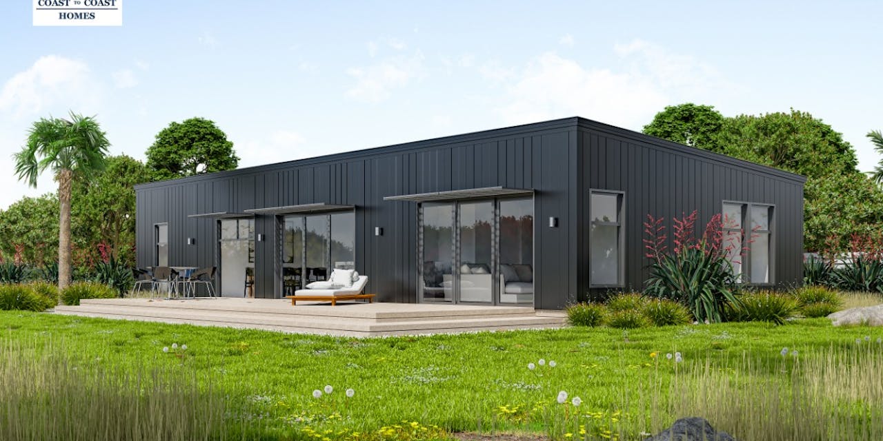 A seamless modern transportable that’s truly rectangle in shape and modern in flavour. Optional full-height glazing will help achieve good light inside and views out across your site. Inside, there are three bedrooms, a master with ensuite, and a spaced-out open plan living. If you have a wide site with a view, this transportable will be right at home!